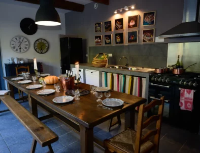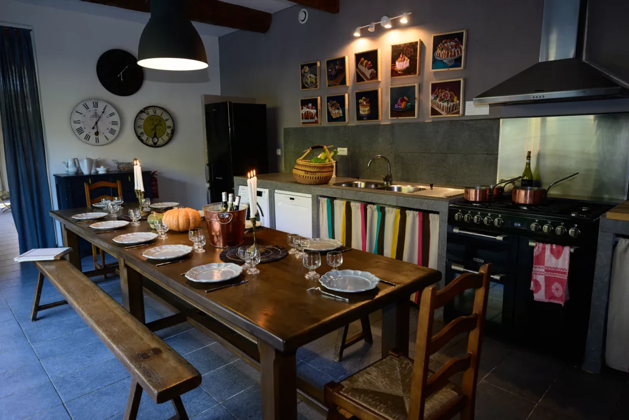 - Une spacieuse cuisine (30m2), entièrement équipée (piano gazinière, lave vaisselle, lave linge, cafetière, grille pain, bouilloire, micro-ondes…), longue table et d’un grand vaisselier avec vaisselle, plats et ustensiles nécessaires à la vie d’un grand groupe