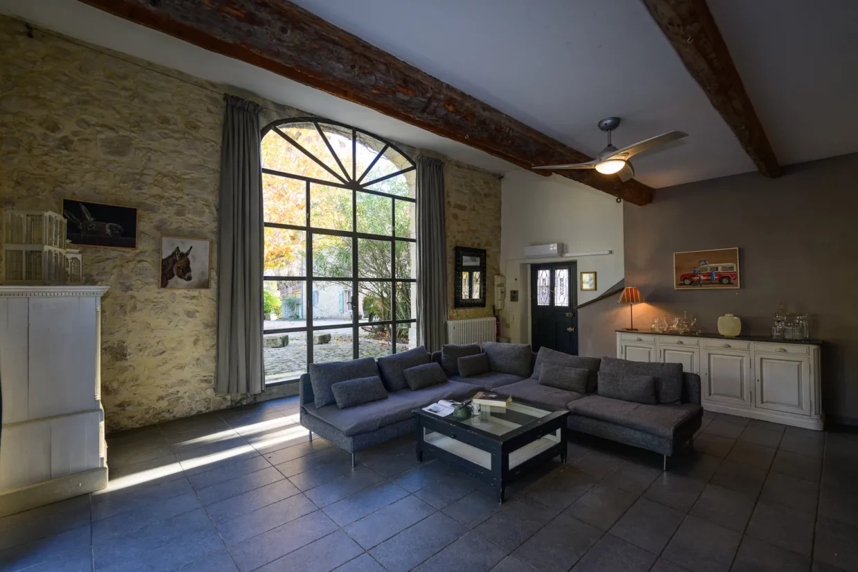 - Un grand et volumineux salon (45 m2), composé d’un grand canapé d’angle, d’une cheminée, d’un long buffet, d’une armoire